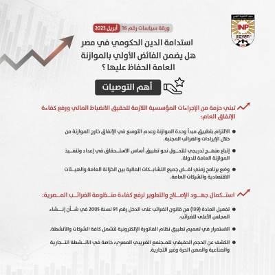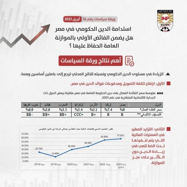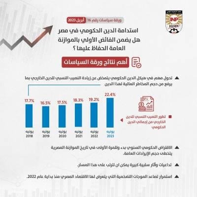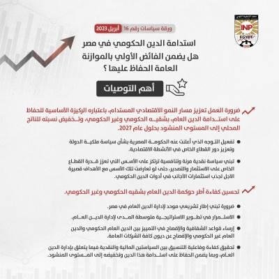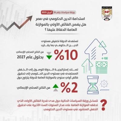 ومن خلال تحليل ورقة السياسات الحالية للتطورات التي شهدها الدين الحكومي المصري على مدار السنوات الست الأخيرة والمصادر الأساسية لتراكم هذا الدين خلال تلك الفترة، توصلت الورقة إلى عدة نتائج من بينها، أن الفائض الأولي الذي حققته الموازنة العامة على مدار السنوات الست الأخيرة غير كاف للحفاظ على استدامه الدين الحكومي، حيث اقترن تحقيق هذا الفائض بزيادة مطردة في قيمة هذا الدين ونسبته للناتج المحلي الإجمالي نتيجة ارتفاع تكلفة الاقتراض ومدفوعات فوائد الدين، فضلاً عن التزايد الكبير في العمليات المالية تحت الخط، والتي تؤدي إلى زيادة تراكم الدين الحكومي دون التأثير على العجز السنوي للموازنة.