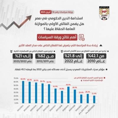 كما أسفر التوسع في الاقتراض الحكومي عن تراجع كبير في نصيب القطاع الخاص من حجم الائتمان المحلي من 42.1% في عام 2010 إلى 21.8% فقط في سبتمبر من عام 2022، وما ترتب على ذلك من تراجع غير مسبوق في حجم الأنشطة والاستثمارات التي يقوم بها هذا القطاع، حيث تشير بيانات وزارة التخطيط إلى تراجع النصيب النسبي للقطاع الخاص من الاستثمارات الكلية المنفذة ليصل إلى 26.2% فقط في العام المالي 2021/2022 في مقابل 62.4% من إجمالي الاستثمارات الكلية في العام المالي 2011/2012.
