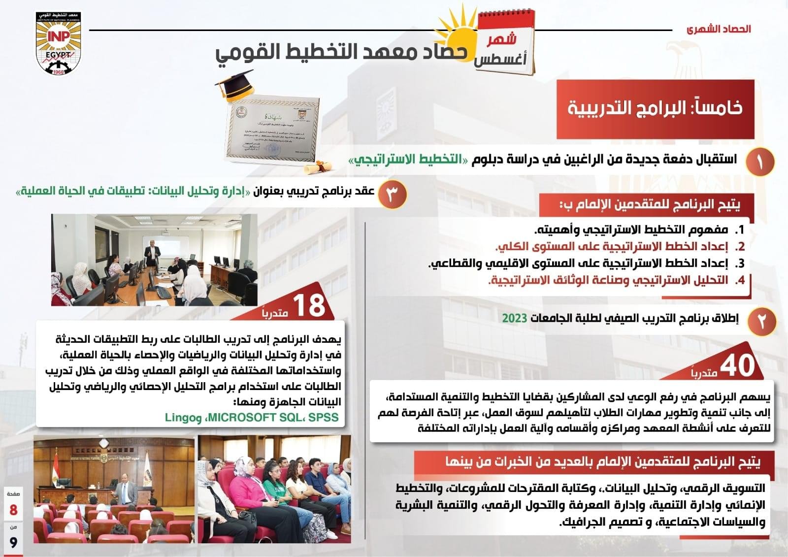 نشر معهد التخطيط القومي تقرير “حصاد أغسطس 2023” حيث يسلط من خلاله الضوء على الأنشطة والفعاليات التي نفذها خلال شهر أغسطس، والتي تنوعت ما بين بروتوكولات التعاون ولقاءات رئيس المعهد ونوابه، إضافة إلى الدراسات العليا والأنشطة البحثية، والندوات، فضلاً عن البرامج التدريبية والاستشارات الفنية التي قدمها المعهد.