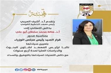 تهنئة : قرار السيد رئيس مجلس الوزراء بتعيين أ.د. هالة محمد سلطان أبو على نائباً لرئيس معهد التخطيط القومي لشئون البحوث والدراسات العلي لمدة أربع سنوات admin2023-05-26T16:25:06+03:00 تهنئة يتقدم أ.د. أشرف العربي رئيس معهد التخطيط القومي بخالص التهاني إلى أ.د. هالة محمد سلطان أبو على بمناسبة... 18 أبريل 2023التصنيف الرئيسىComments OffRead more...